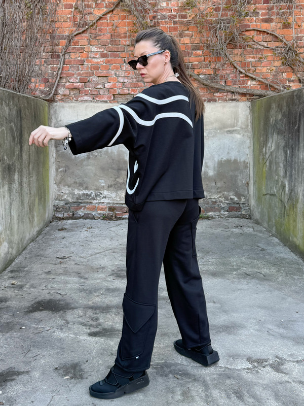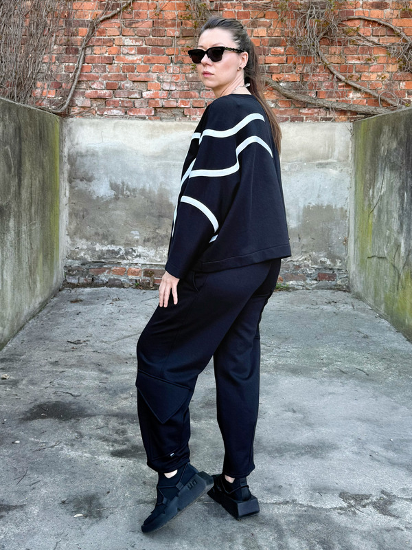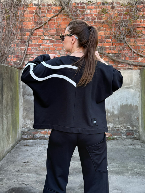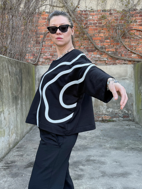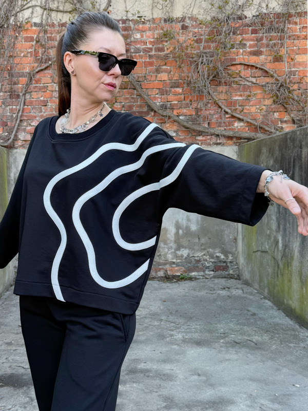 Bluza FLOW to propozycja dla kobiet, które szukają swobodnego fasonu i nieszablonowego detalu. Asymetryczne, kontrastowe zdobienie płynnie przechodzące z przodu na plecy sprawia, że klasyczna czerń nabiera wyrazistego, graficznego charakteru. To element, który przyciąga wzrok i podkreśla indywidualny styl.
