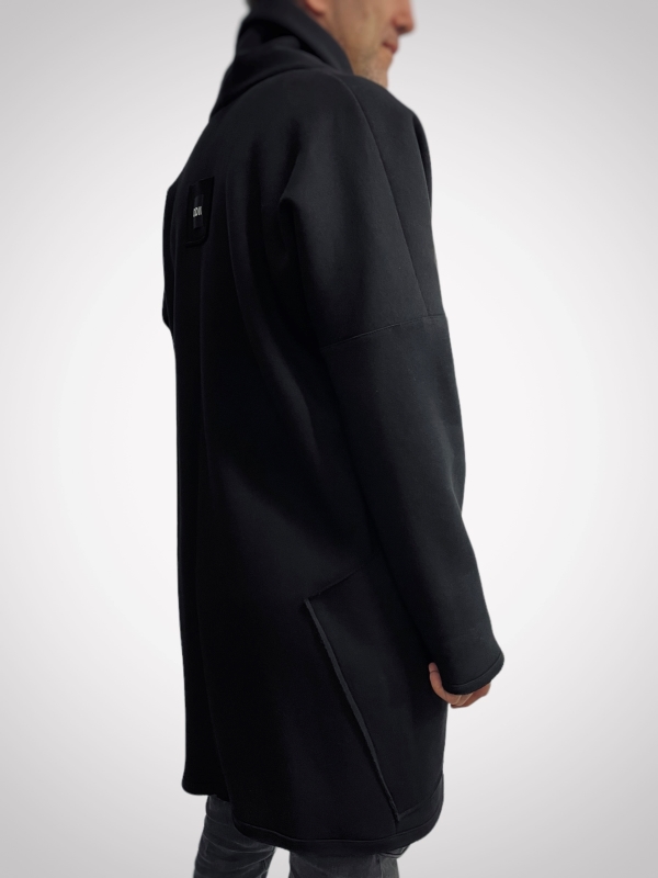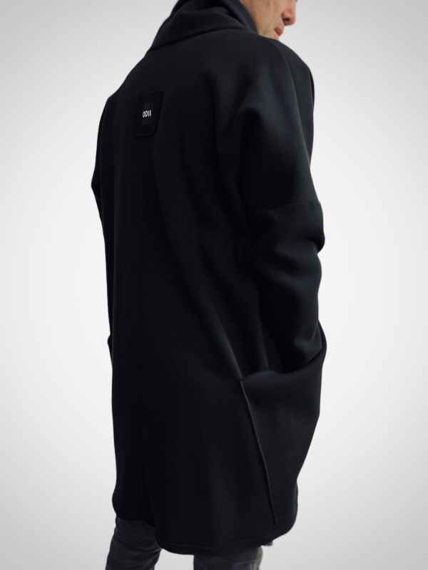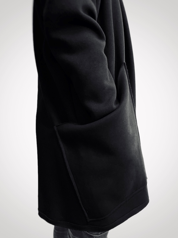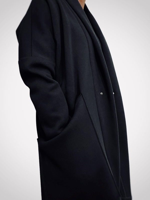 Prosty, kimonowy krój o obniżonej linii ramion. Kołnierz szalowy, duże kieszenie.