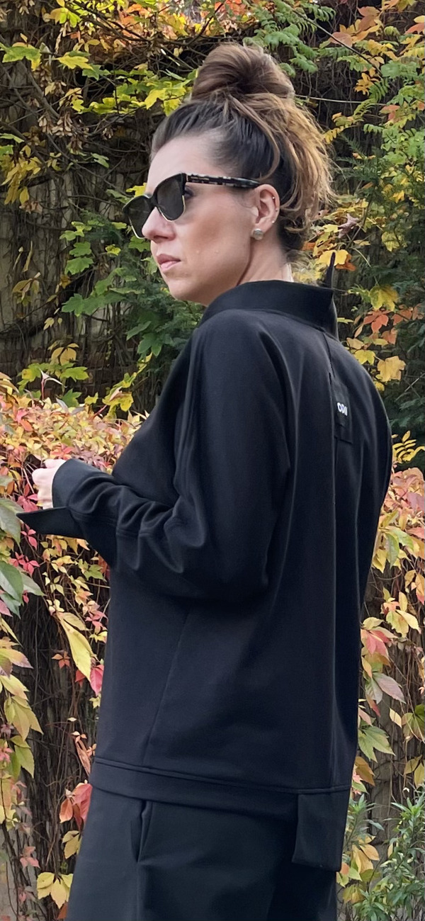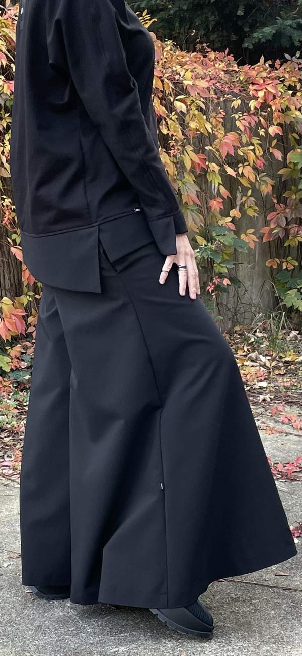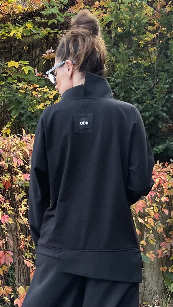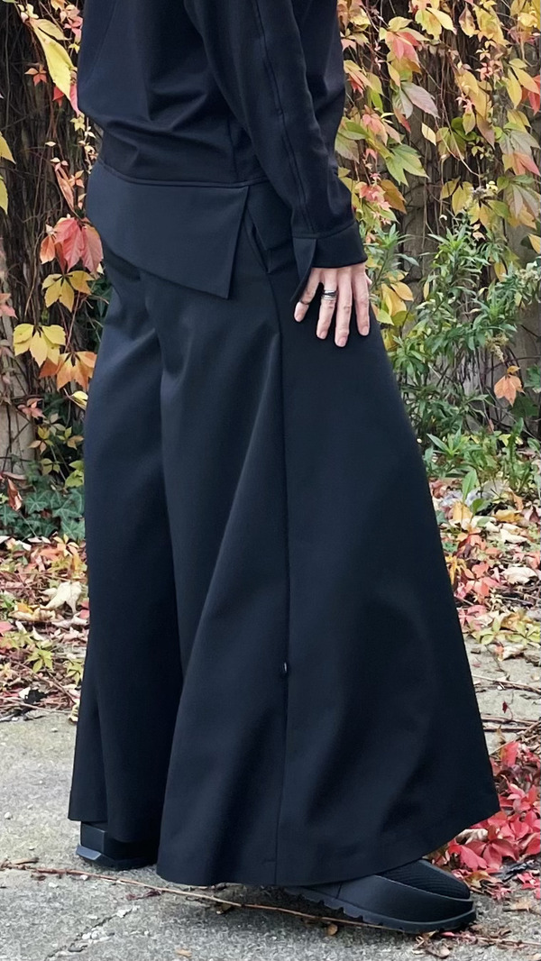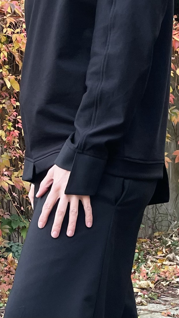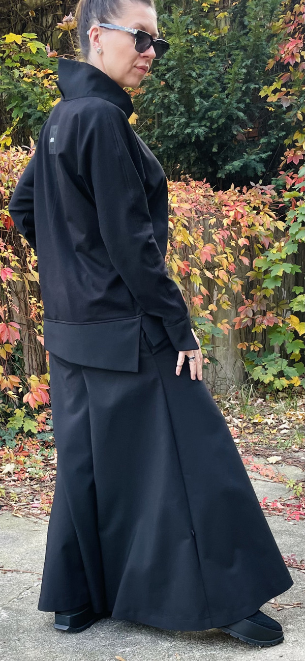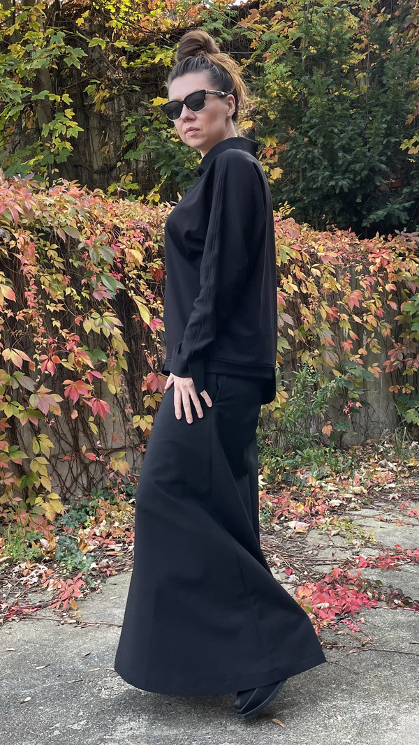 Klasyczna czerń dodaje stylizacji uniwersalności i elegancji, a dzięki wykorzystaniu najwyższej jakości materiałów oraz nietypowym rozwiązaniom konstrukcyjnym, całość wpisuje się w nowoczesne trendy mody minimalistycznej. Każdy detal – od asymetrii ściągaczy, po stójkę przy dekolcie i szerokie nogawki spodni – został starannie przemyślany, aby tworzyć spójną i harmonijną całość.
