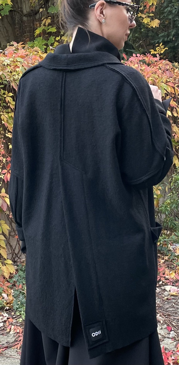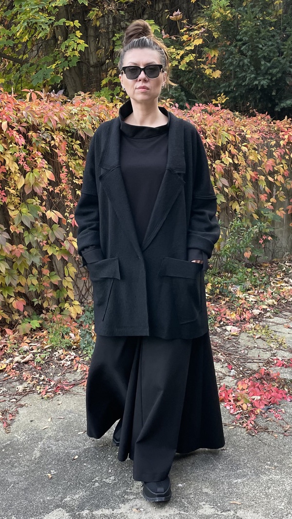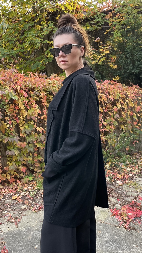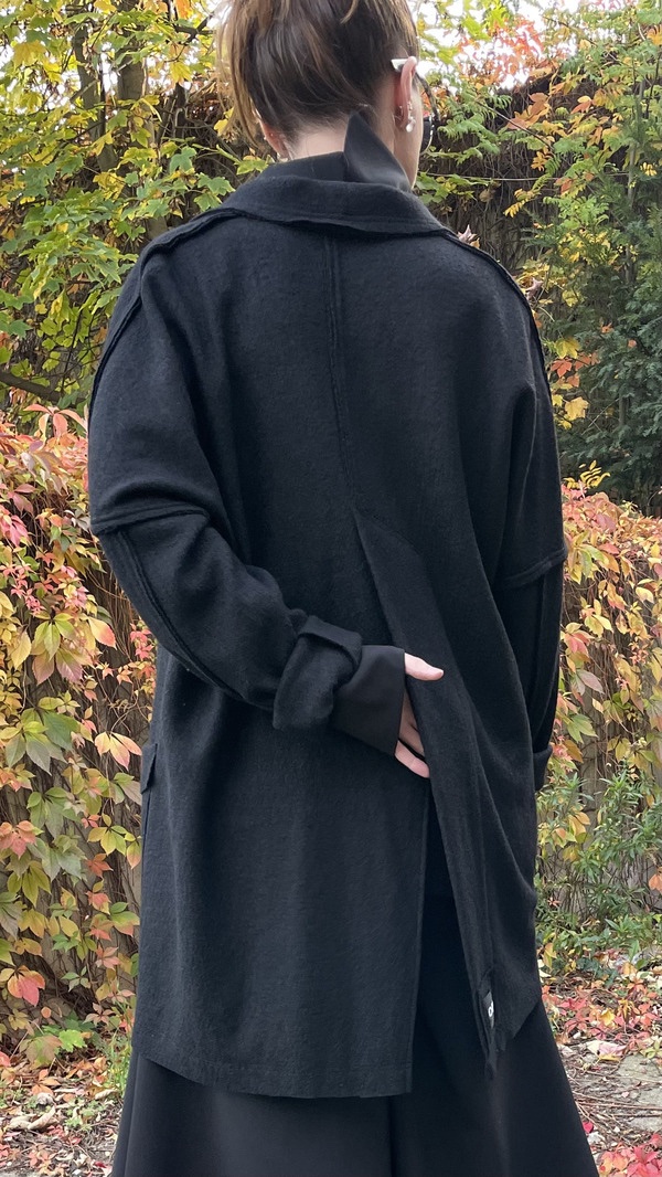 Dzięki swojej uniwersalności, surowym wykończeniom i unikalnym detalom, ten wełniany kardigan/marynarka będzie idealnym wyborem na chłodniejsze miesiące, dla osób ceniących sobie zarówno komfort, jak i nietuzinkowy styl.