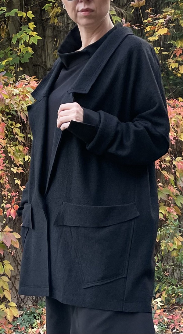 Kardigan / marynarka z wełny parzonej, który widzimy na zdjęciach, to doskonałe połączenie elegancji i swobodnego, surowego stylu. Jest wykonany z wełny parzonej 80% o średniej gramaturze 430g/m2 i 20% poliamidu co zapewnia ciepło, jednocześnie nie obciążając sylwetki. Każdy z tych materiałów ma swoje unikalne właściwości, które razem tworzą bardzo funkcjonalną i trwałą mieszankę. To doskonały balans między naturalnym ciepłem i wygodą, a syntetyczną trwałością i elastycznością.