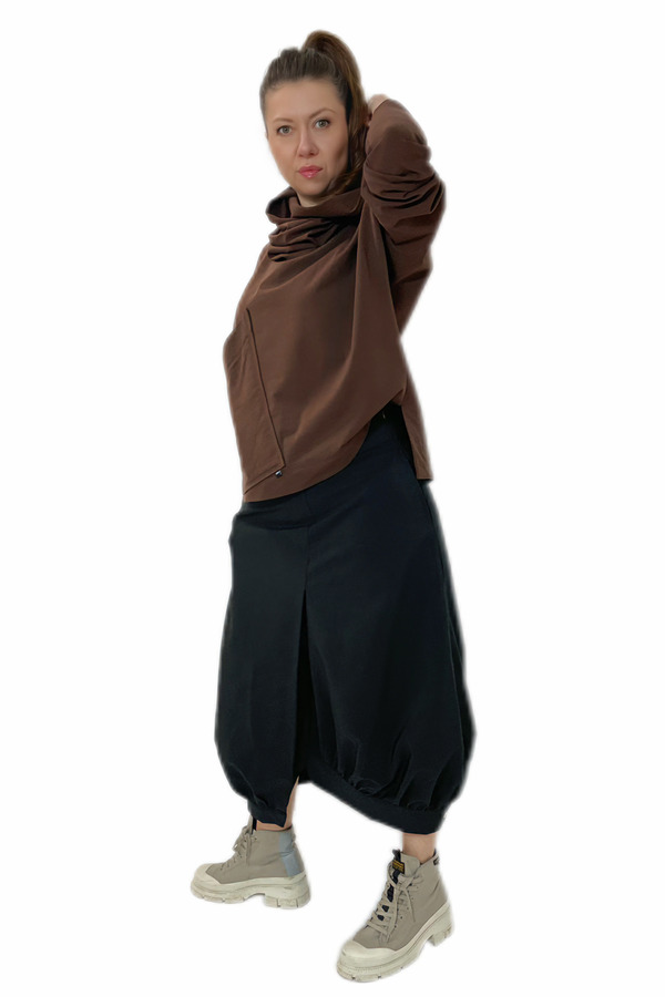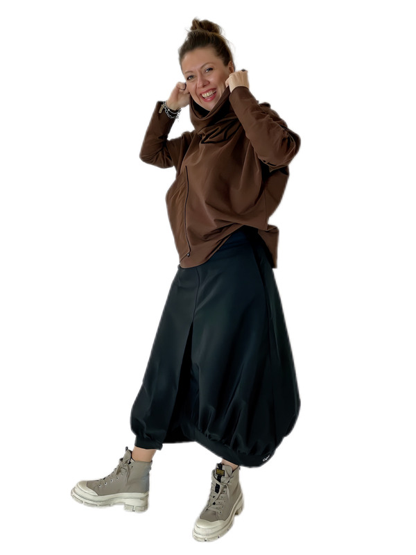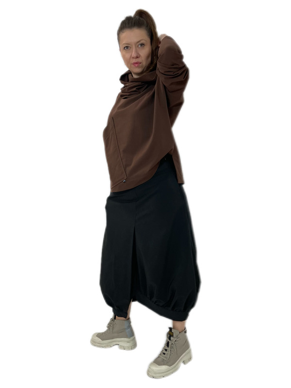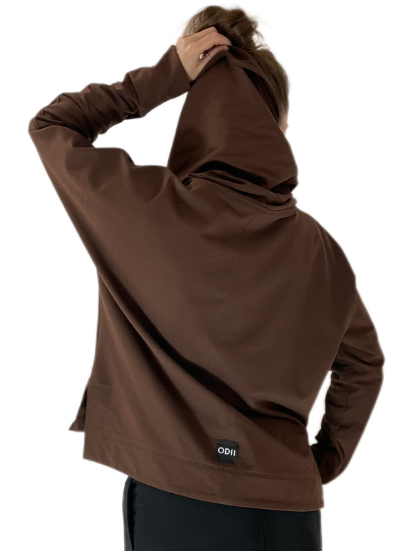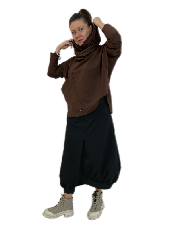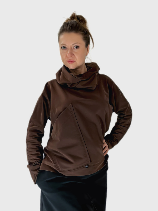 Bluza w odcieniu głębokiego brązu przywodzi na myśl ciepło jesiennych liści i spokój natury. Asymetryczna długość – krótszy przód i wydłużony tył (różnica 6 cm) – nadaje jej nowoczesnego charakteru, a jednocześnie zapewnia swobodę i wygodę w każdej stylizacji.