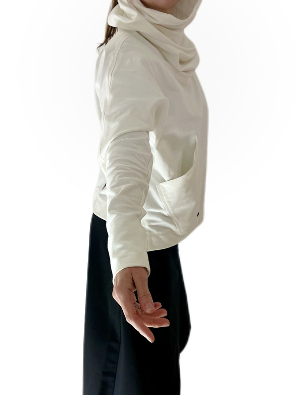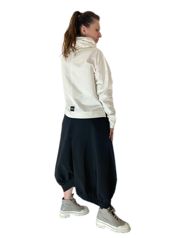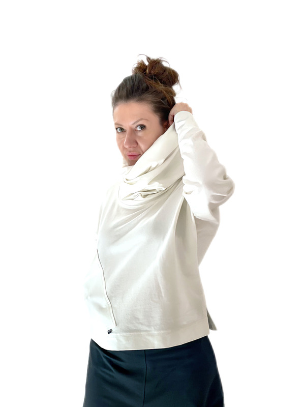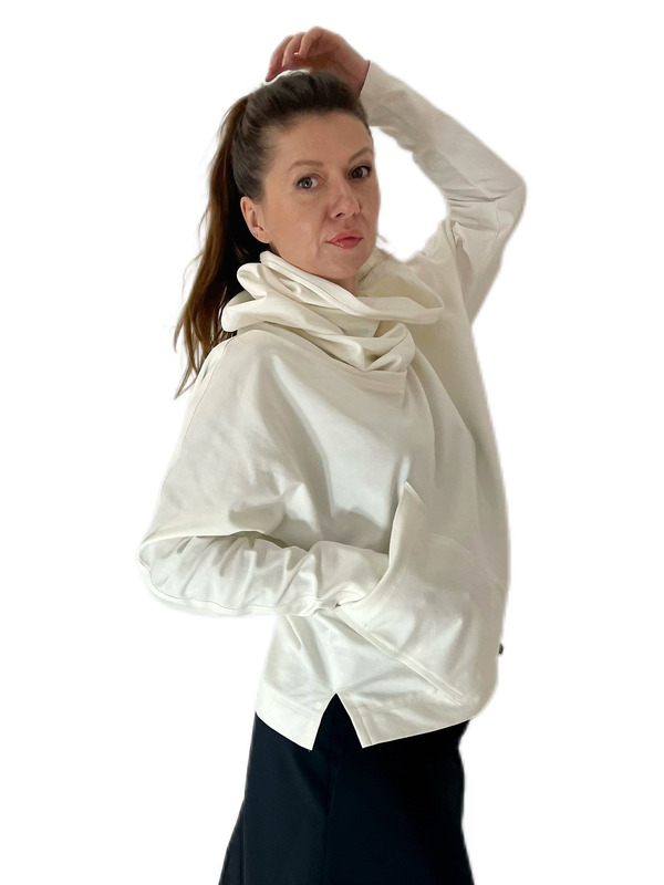 Na zdjęciu widoczna jest możliwość stylizacji bluzy z podkreśleniem jej wyjątkowego kroju i detali, które nadają jej uniwersalności.