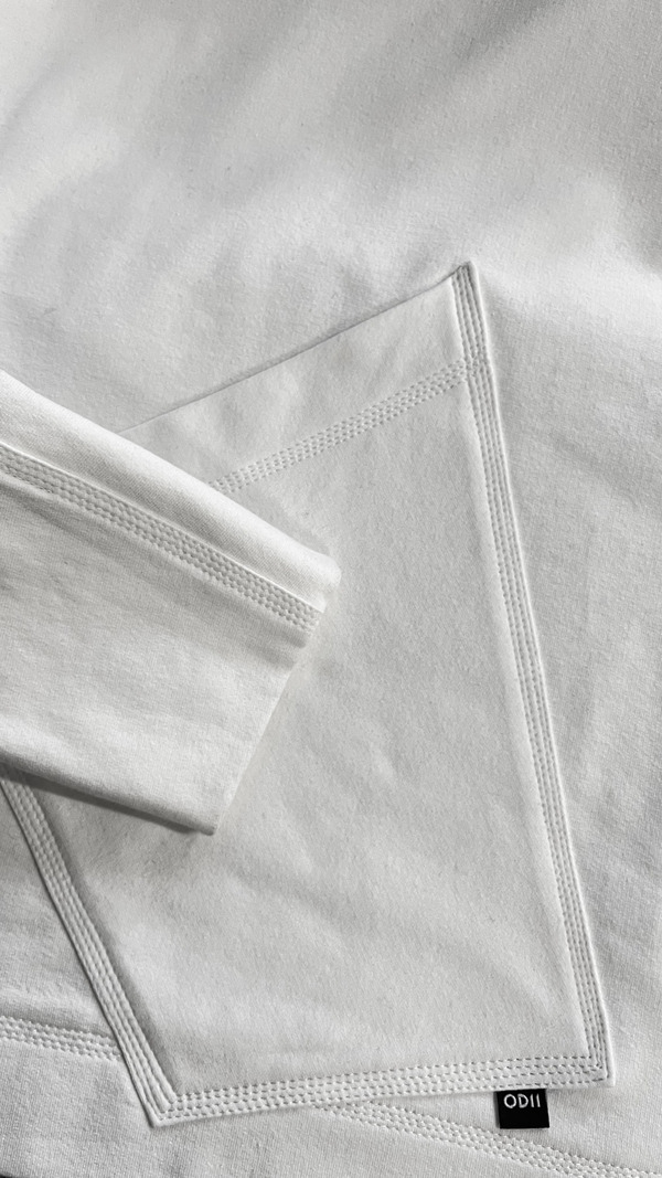 Niezwykle designerskim akcentem, który wyróżnia bluzy z tej kolekcji, jest przeszycie wykonane 4-ro stebnówką. Ten wyjątkowo pracochłonny detal z wielką precyzją zdobi bluzę, dodając jej unikalności i charakteru. Wyjątkowy w swojej prostocie, ze smakiem podkreśla ręczne wykonanie i dbałość o każdy szczegół.