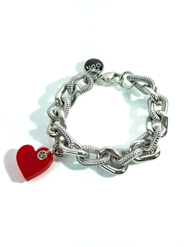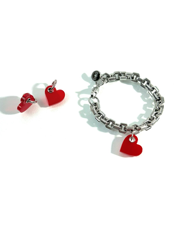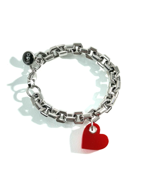 Bransoleta wykonana jest w całości ze stali szlachetnej. Centralnym elementem jest czerwone serce z żywicy epoxy, które swobodnie pracuje i naturalnie układa się na nadgarstku.