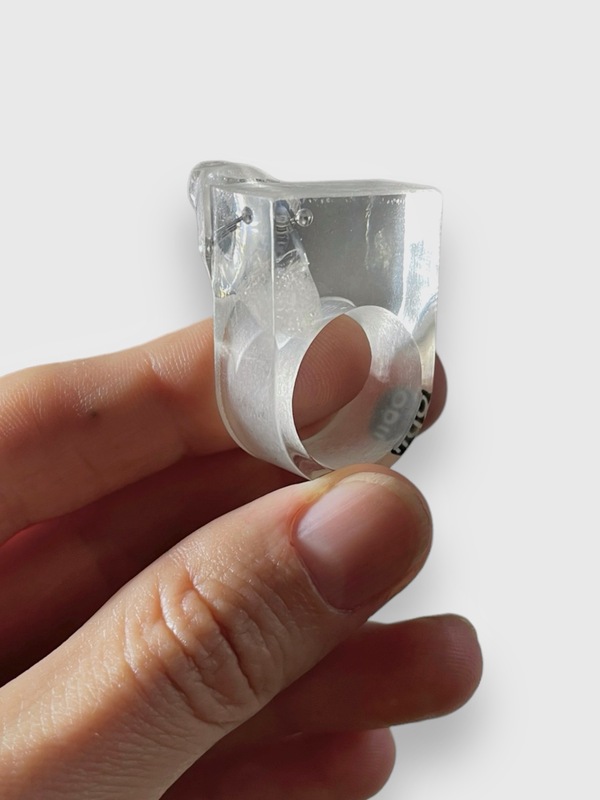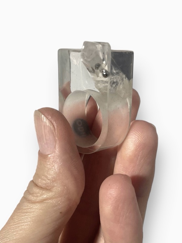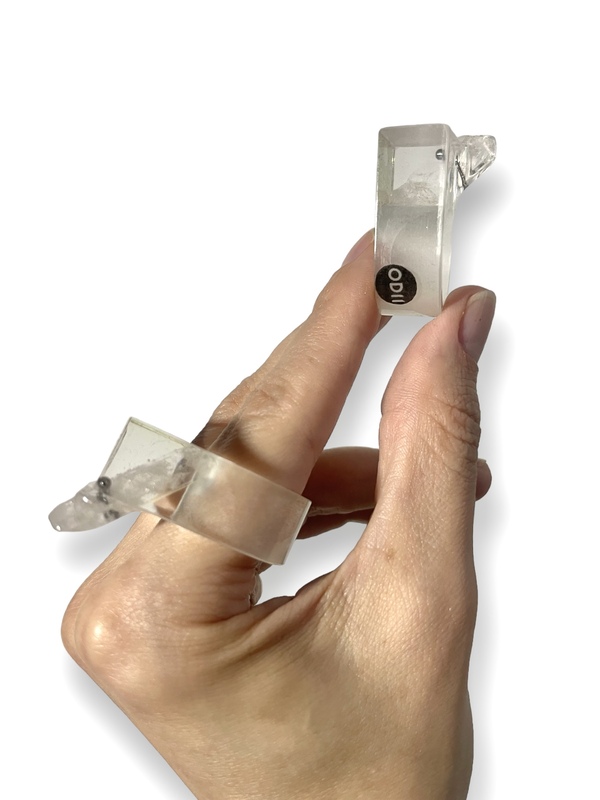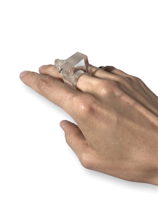Mimo swojej odważnej formy, pierścionek jest niezwykle wygodny i doskonale wyważony, dzięki czemu idealnie dopasowuje się do palca, oferując komfort noszenia przez cały dzień. Jego unikatowy design przyciąga wzrok, a połączenie surowości naturalnego kamienia z nowoczesnym, transparentnym tworzywem sprawia, że staje się wyjątkowym dodatkiem, który podkreśla indywidualność oraz wyczucie stylu osoby, która go nosi.
