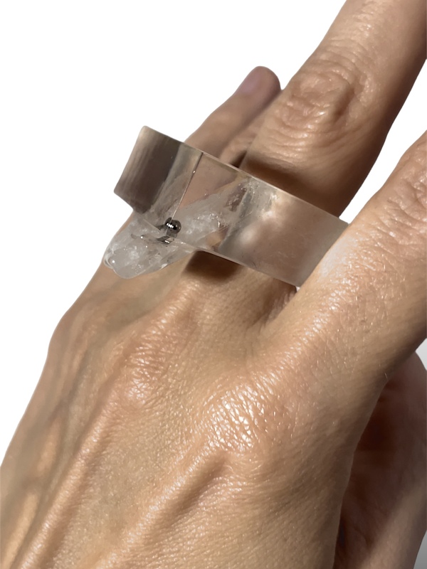 Pierścionek ręcznie wykonany, przypominający bryłe lodu z wtopionym, surowym kryształem górskim.