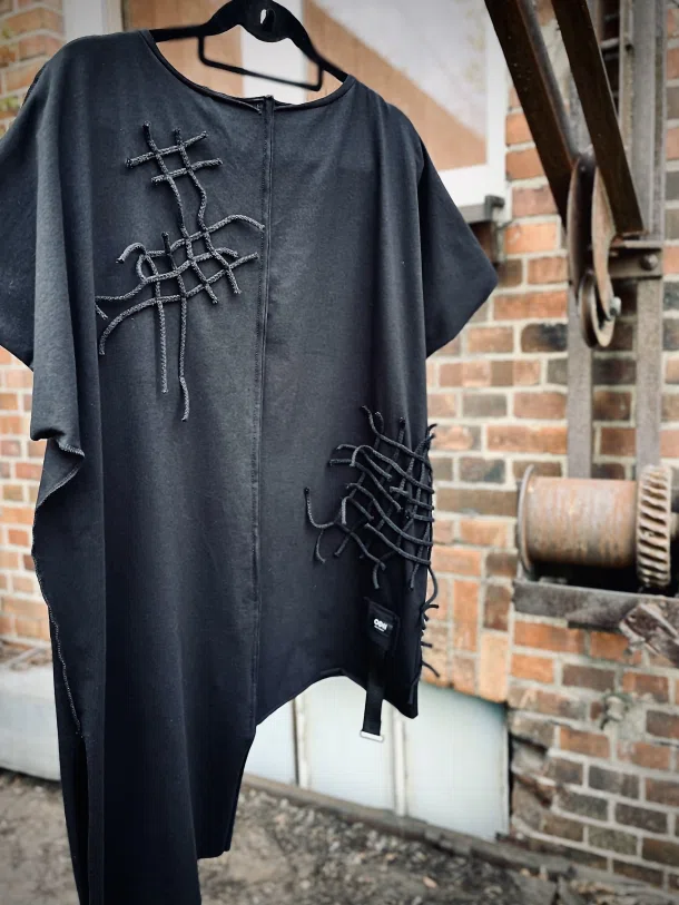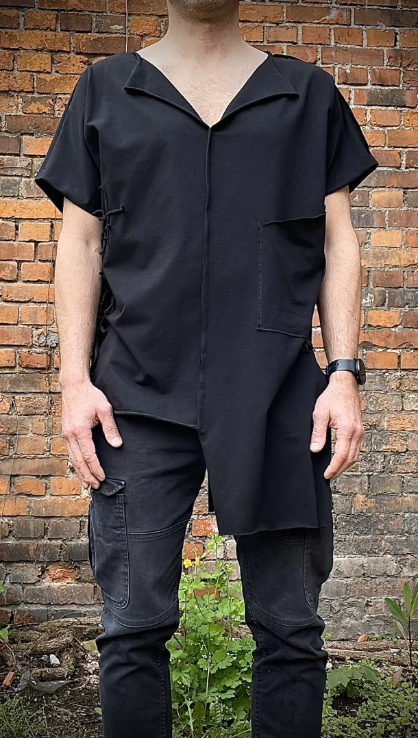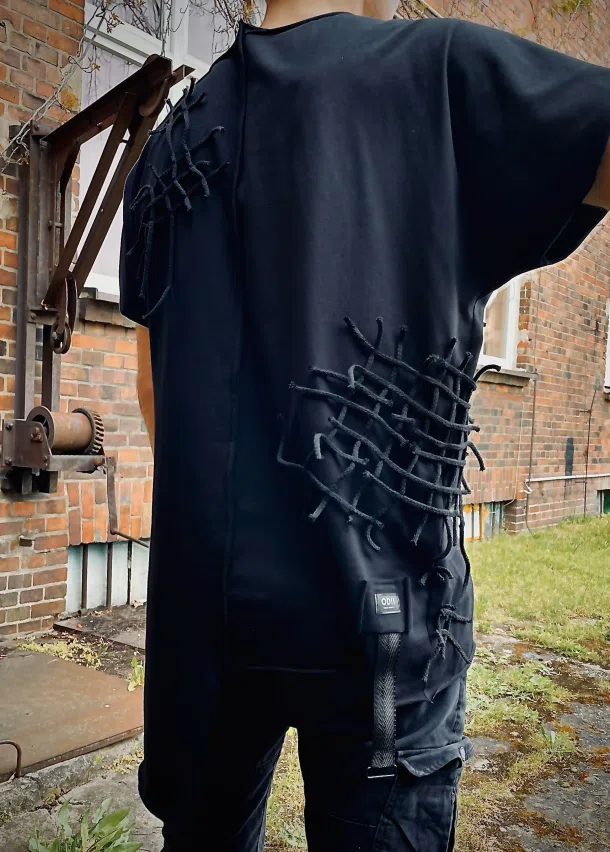 Niesztampowy outfit męski/damski, lumpiarski a zarazem dopracowany w detale. Połączenie materiału ze sznurkiem dodaje designerskiego look’u. Luźny i wyraźny akcent stylizacji.