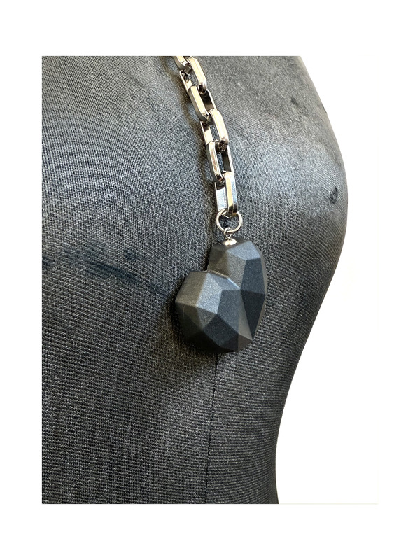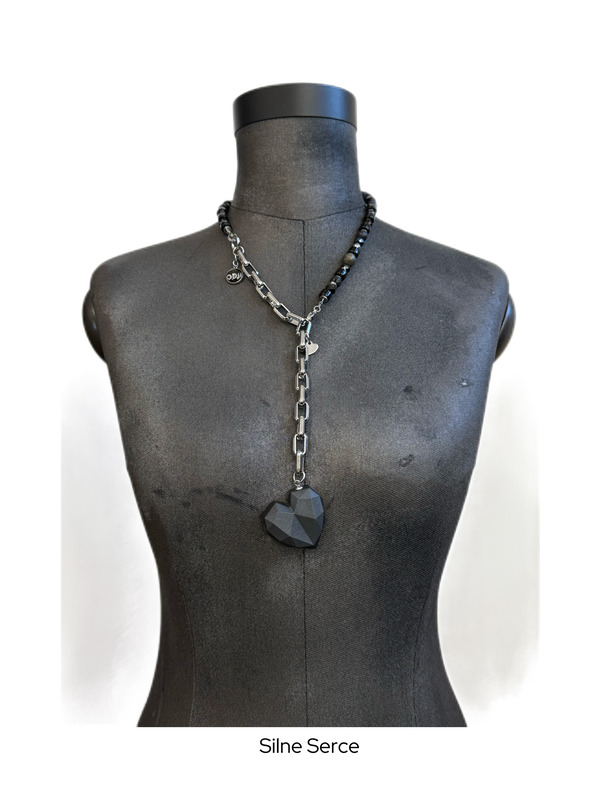 Wyrazisty naszyjnik, który od razu przyciąga wzrok. Ma duży, geometryczny wisior w kształcie serca i oryginalne połączenie kamieni: onyksu, pirytu, hematytu i perły. Baza to stal szlachetna 304— trwała i hipoalergiczna.