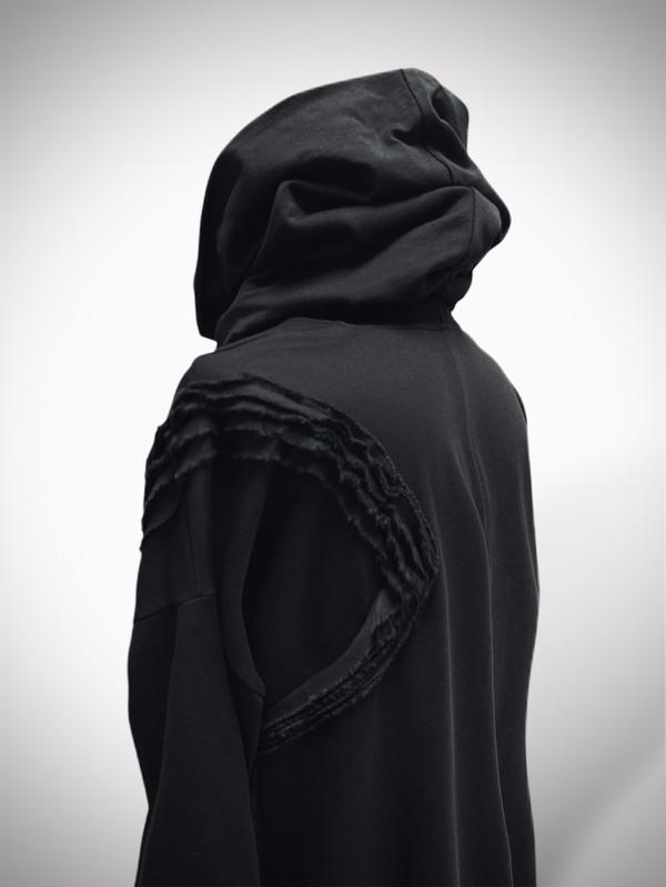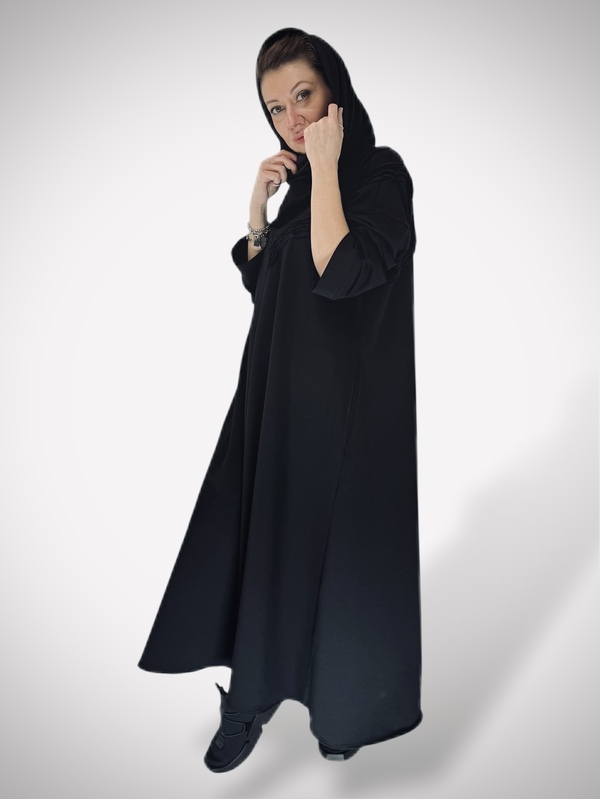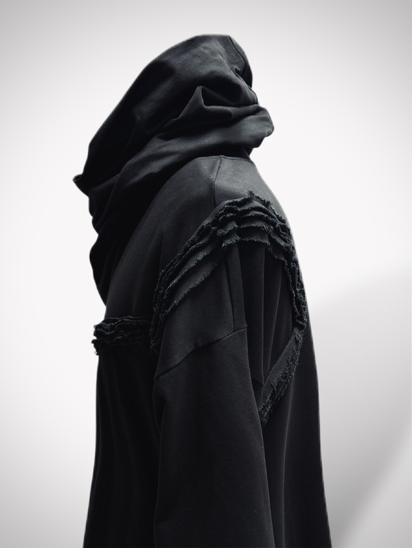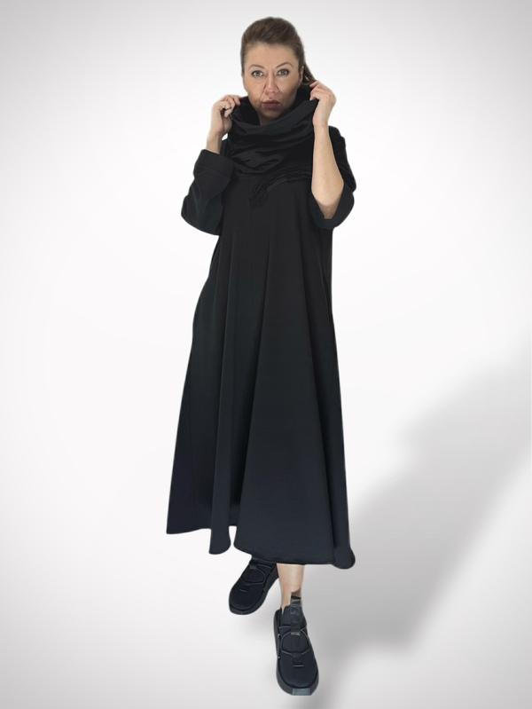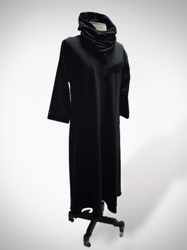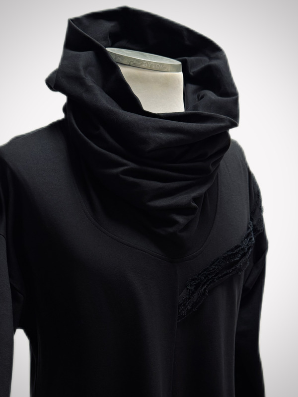 Dekolt z kominem daje możliwość noszenia na dwa sposoby – jako otulający kołnierz lub narzucony na głowę w formie kaptura.