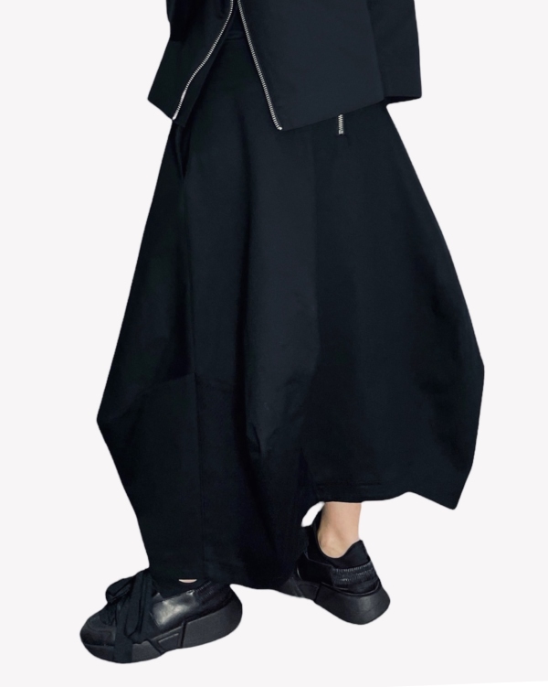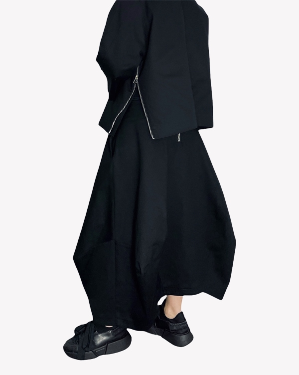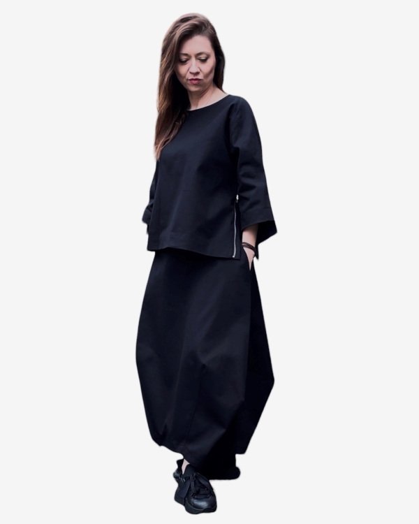 Składający się z osobno dostępnych elementów – bluzki i spódnicy, oferuje nie tylko różnorodność, ale także możliwość noszenia poszczególnych elementów osobno, co dodaje mu praktyczności. Zarówno górna, jak i dolna część tego zestawu cechują się precyzyjnym krojem pudełkowym, podkreślającym sylwetkę i dodającym subtelnego luksusu.